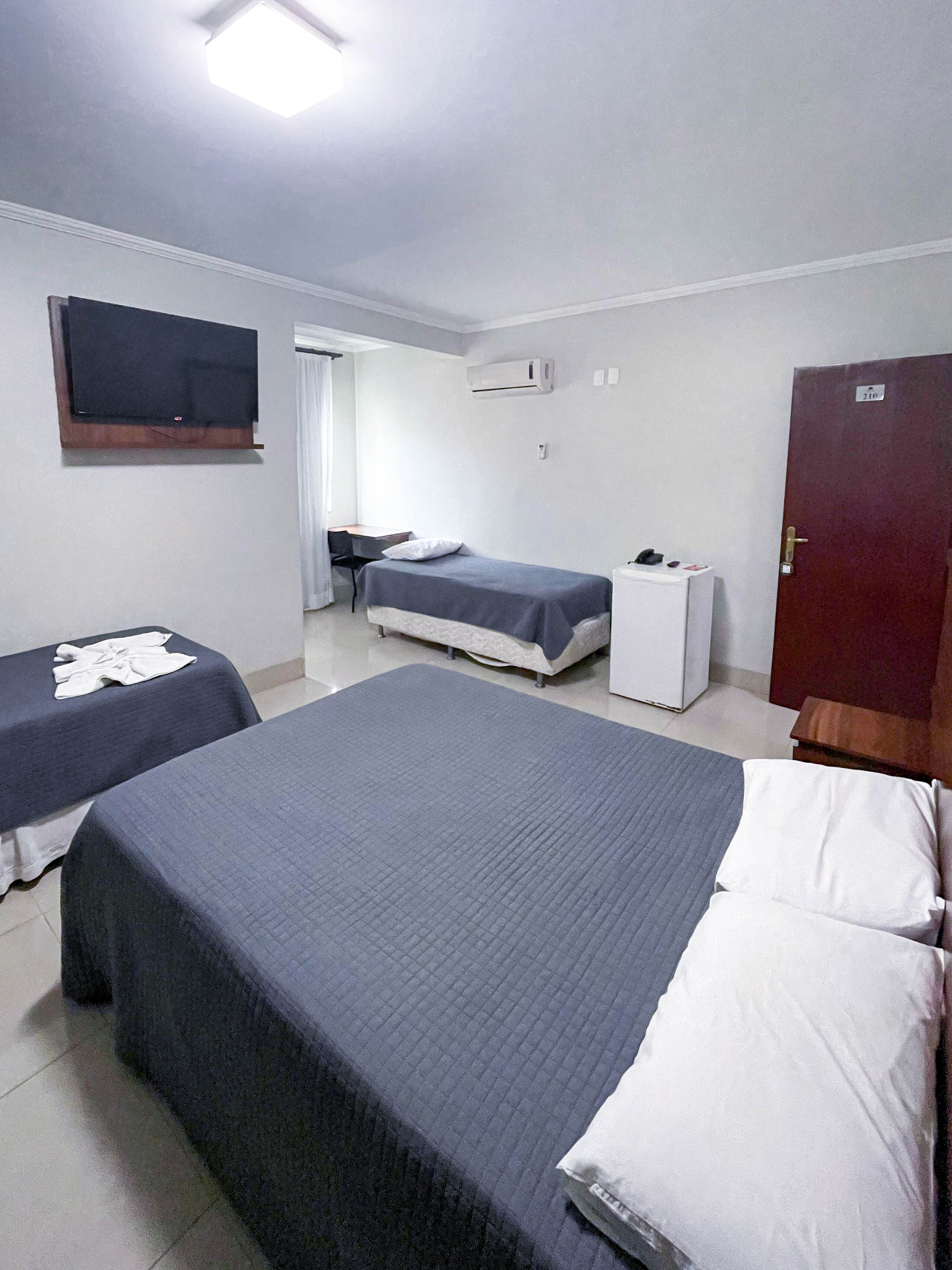 Cama de casal, duas camas de solteiro, TV, ar-condicionado, telefone, mesa, amenidades de banho (sabonete, toalhas, etc.), Wi-Fi